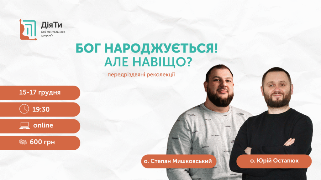 Бог народжується. Але навіщо? — Відповідь на це запитання знайдемо на традиційних передріздвяних реколекціях з духівниками Хабу ментального здоров’я «ДіяТи». Реколектанти: о. Юрій Остапюк — священник-капелан НУ «Львівська Політехніка», голова Центру Студентського Капеланства у Львові та співзасновник хабу «ДіяТи». о. Степан Мишковський — священник, ексголова комісії у справах молоді Львівської архиєпархії, засновник та фронтмен гурту […]